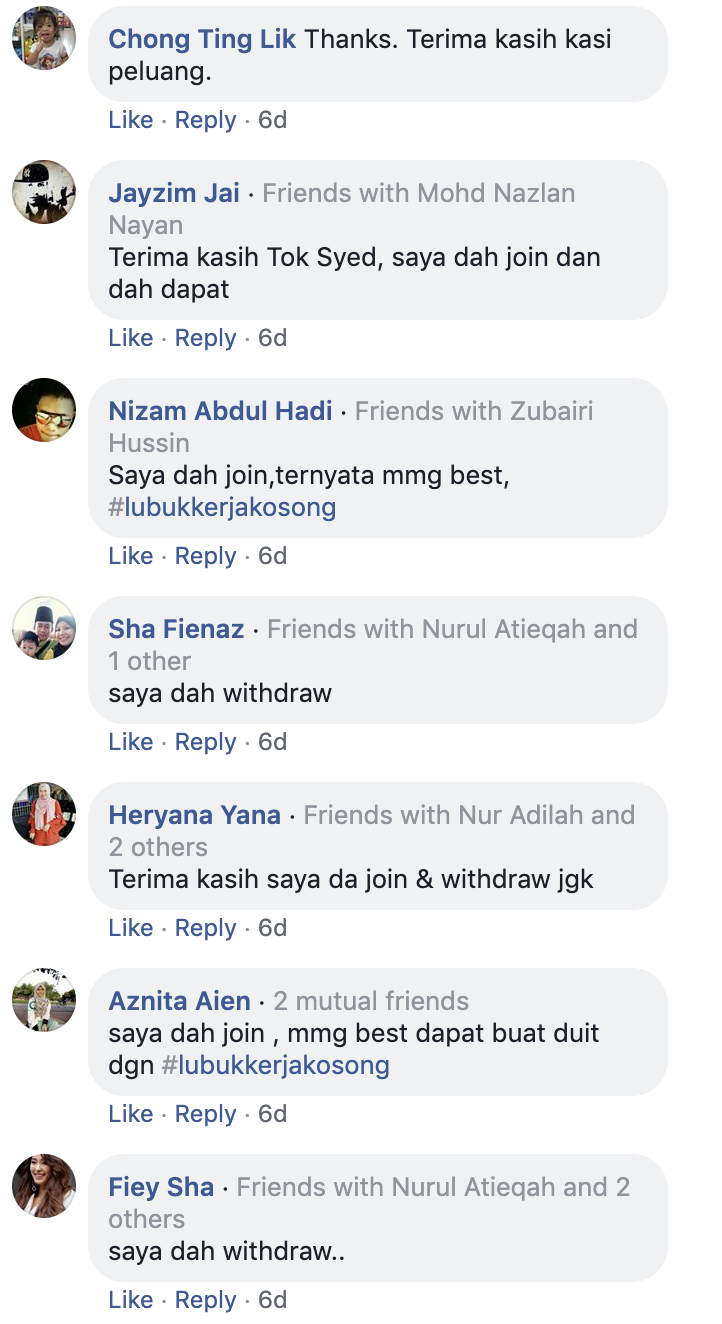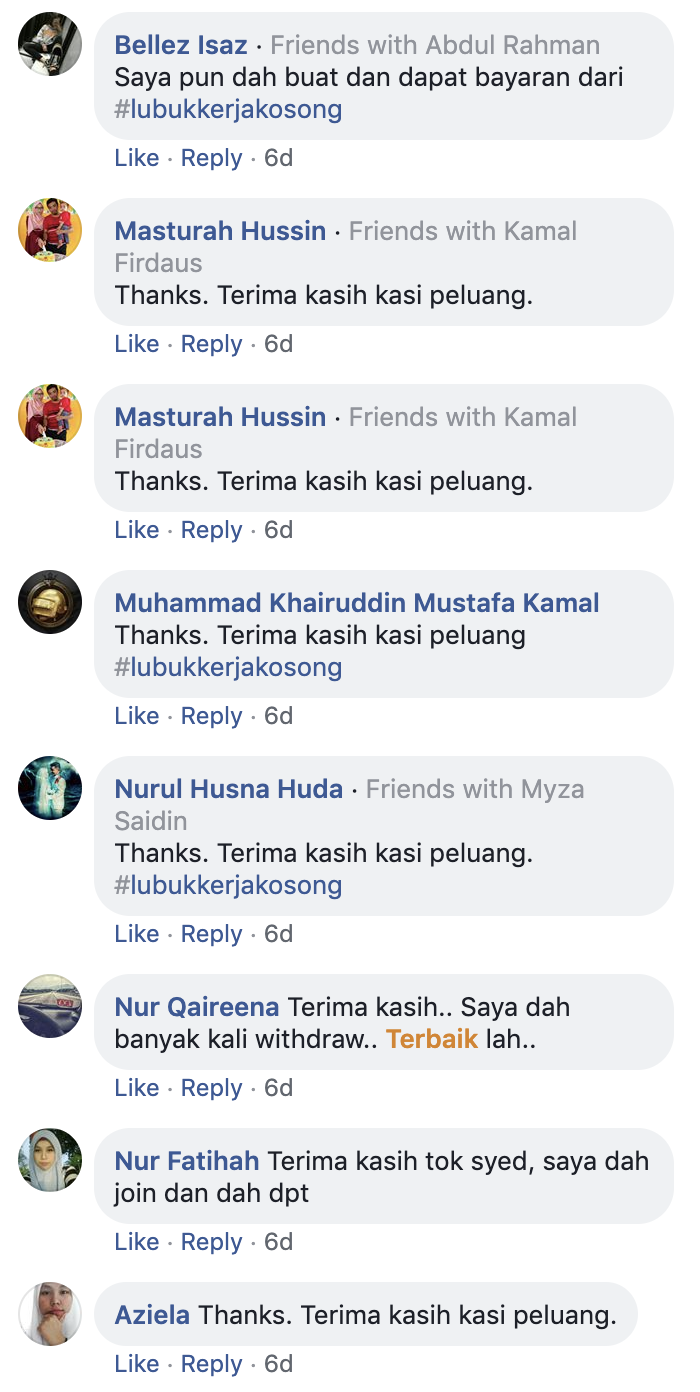 "Duduk di rumah sahaja, share di FB.. ada yang share di Whatsapp" Senang kan? Jadi sebab itu kami perkenalkan beberapa platform khas (lubuk tersebut) untuk anda semua yang sukar mendapat pekerjaan. Di lubuk ini, kami sediakan kerja-kerja atau task yang anda boleh buat setiap hari.